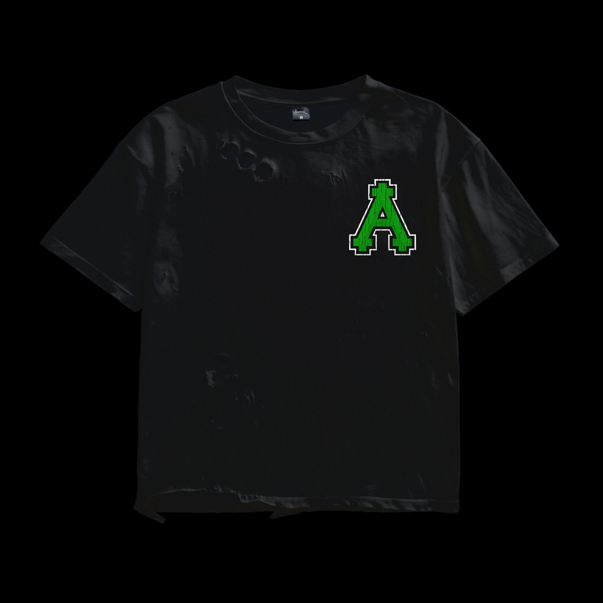 100% cotton, 200gsm, cropped, distressed and sun faded tee with front and back screen printing. If you do not prefer the cropped look, please consider sizing up.